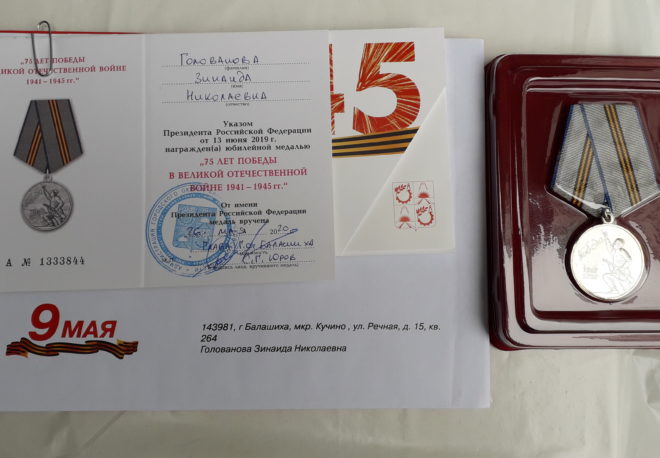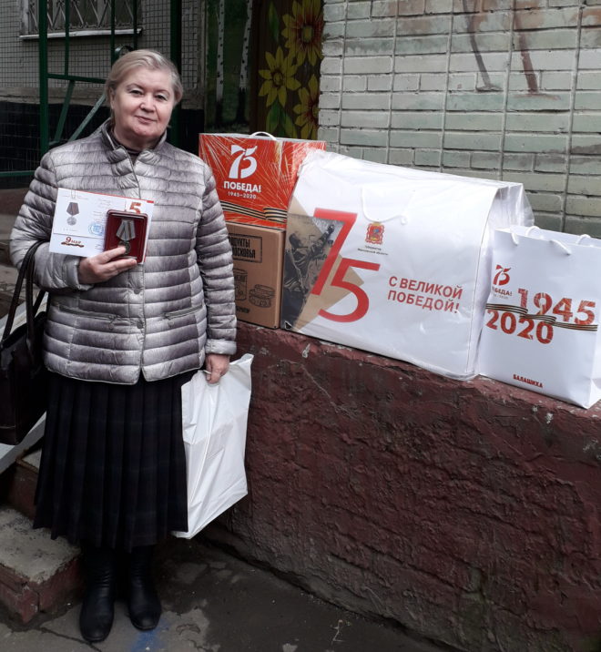 Руководитель исполкома местного отделения «ОФИЦЕРОВ РОССИИ» Розалия Абатурова и председатель местной ветеранской организации Юрий Богомаз от лица Президента России передали поздравления с 75-летием Победы и юбилейную медаль ветерану Великой Отечественной войны Зинаиде Головановой. Они также передали подарки и поздравительные слова от губернатора Подмосковья Андрея Воробьева и главы Балашихи Сергея Юрова.