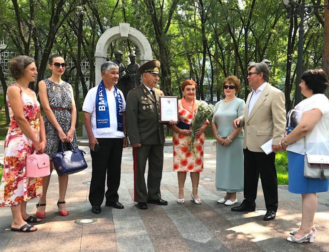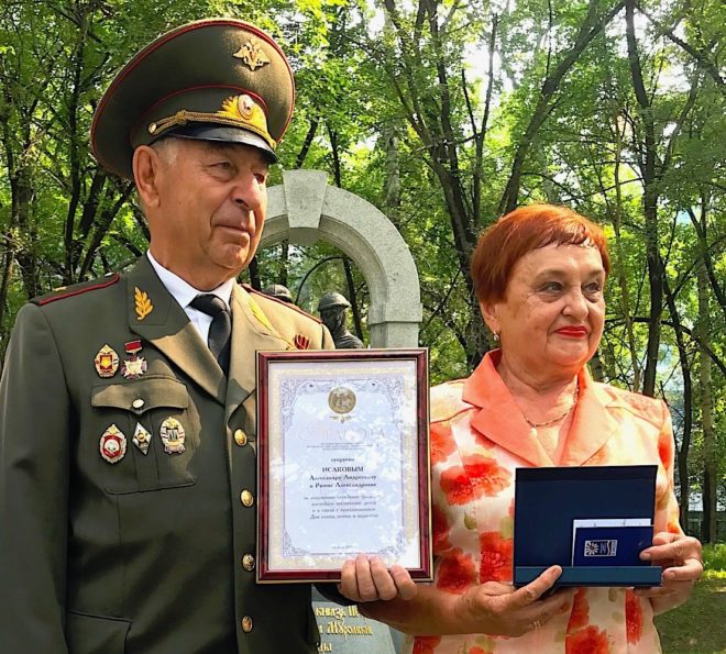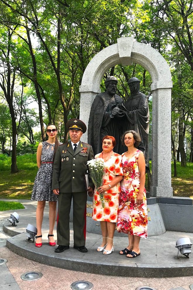 В Хабаровске активисты регионального отделения «ОФИЦЕРОВ РОССИИ» поздравили супругов Исаковых – генерал-майора в отставке Александра Андреевича и Римму Александровну с Днем любви, семьи и верности. На торжественное мероприятие на аллее Любви и верности у памятника святых Петра и Февронии собрались члены организации, дочери, родные, друзья.