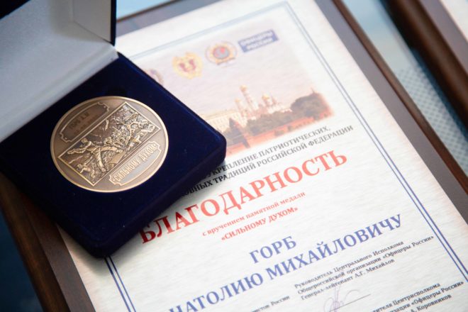 Член организации «ОФИЦЕРЫ РОССИИ» Анатолий Горб удостоен благодарности и медали «Сильному духом». Офицер совершил героический поступок – рискуя жизнью, спас из пожара несколько человек еще до приезда пожарной машины и скорой помощи. Благодаря его быстрым и смелым действиям четыре человека не пострадали.