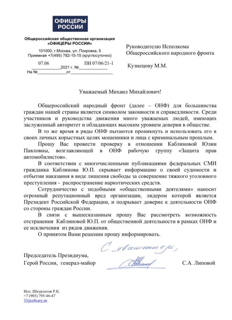 Председатель Президиума «ОФИЦЕРОВ РОССИИ», Герой России, генерал-майор Сергей Липовой обратился к руководителю Исполкома Общероссийского народного фронта Михаилу Кузнецову с просьбой провести проверку в отношении активистки ОНФ Юлии Каблиновой, которая в прошлом была осуждена за незаконный оборот наркотиков.