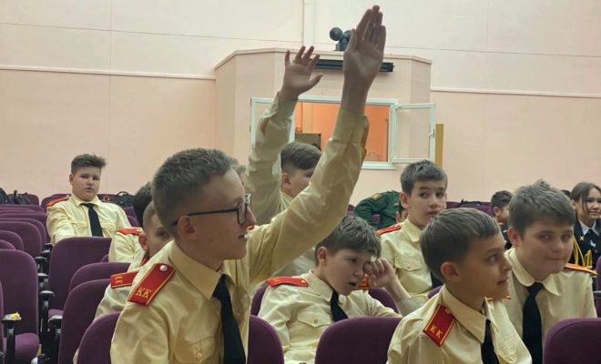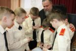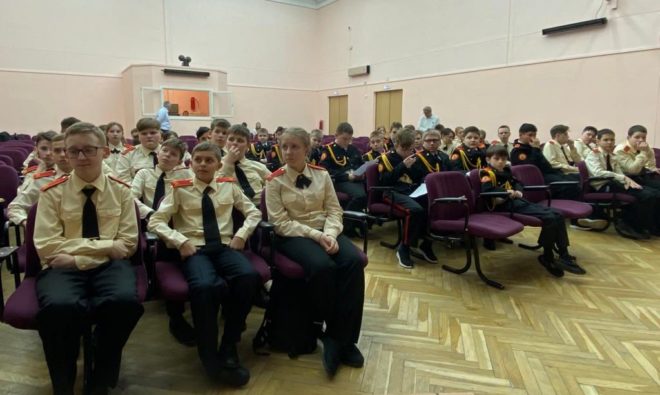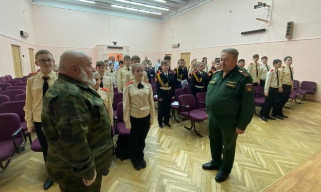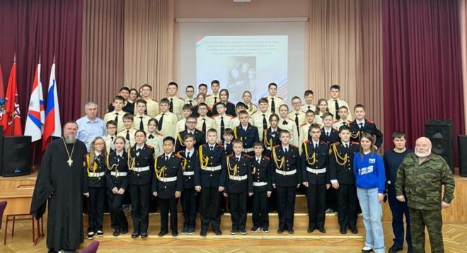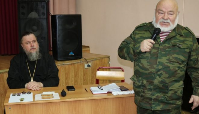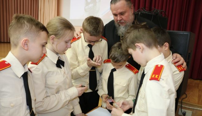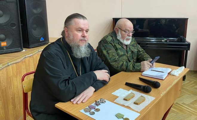 В гости к учащимся кадетских классов пришли член Президиума «ОФИЦЕРОВ РОССИИ», генерал-майор Николай Тутрин и настоятель храма святого праведного воина Феодора Ушакова игумен Домиан.