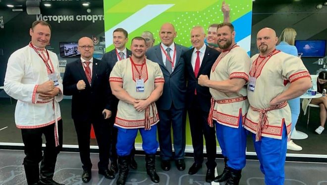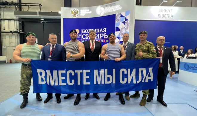Настоящими звездами стали патриоты из Сибири, которые продемонстрировали свою силу под аплодисменты зрителей. Представители организации «Сильнейшая нация мира» в тельняшках и беретах показали силовое шоу.