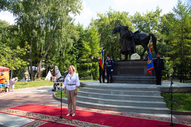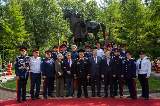 Руководитель Департамента национальной политики и межрегиональных связей города Москвы Виталий Сучков огласил приветствие заместителя Мэра Москвы в Правительстве Москвы по вопросам региональной безопасности и информационной политики Александра Горбенко: «На протяжении 450 лет донские казаки своими славными делами – участием в военных кампаниях, освоением новых территорий, охраной границ – создавали героическую летопись нашего государства. Одним из ярких представителей и руководителей Войска Донского являлся атаман Матвей Иванович Платов. Герой Отечественной войны 1812 года, он неизменно проявлял мужество и доблесть во славу Отечества, казачества и веры православной. Жизненный путь атамана Платова – образец высочайшего патриотизма и служения Родине».