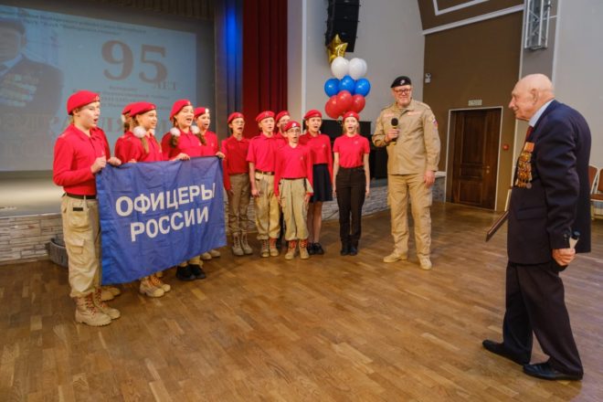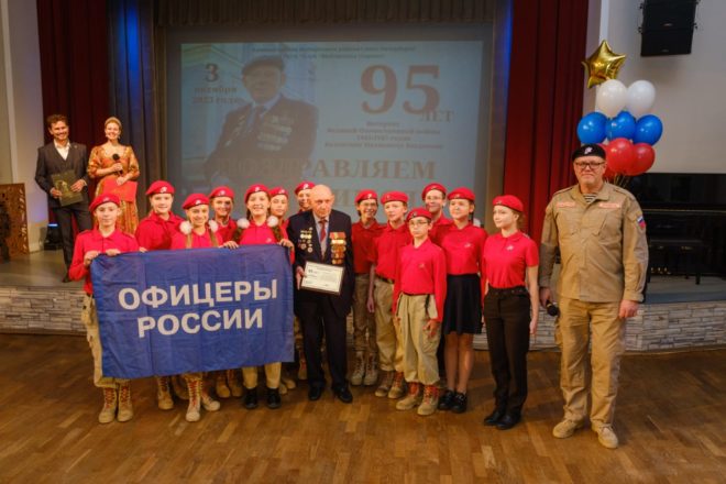 Член Совета по развитию региональной деятельности «ОФИЦЕРОВ РОССИИ» в Санкт-Петербурге Владимир Кузьмин совместно с юнармейцами школы №104 имени М.С. Харченко поздравил со славным юбилеем ветерана Великой Отечественной войны Валентина Ивановича Богданова.