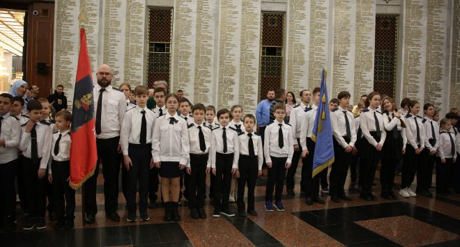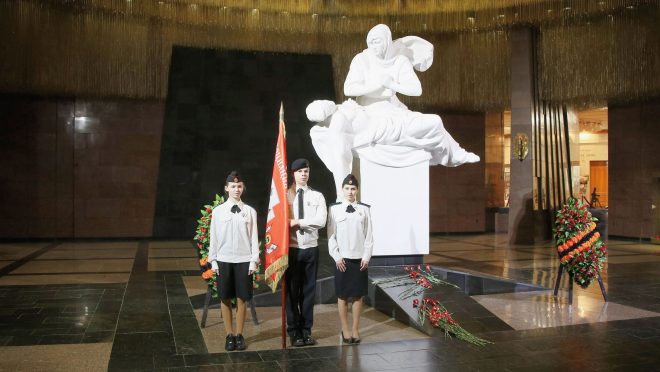 Московские и подмосковные воспитанники клубов «Ассоциации витязей» возложили цветы к скульптурной группе «Скорбь» в зале Памяти и Скорби.