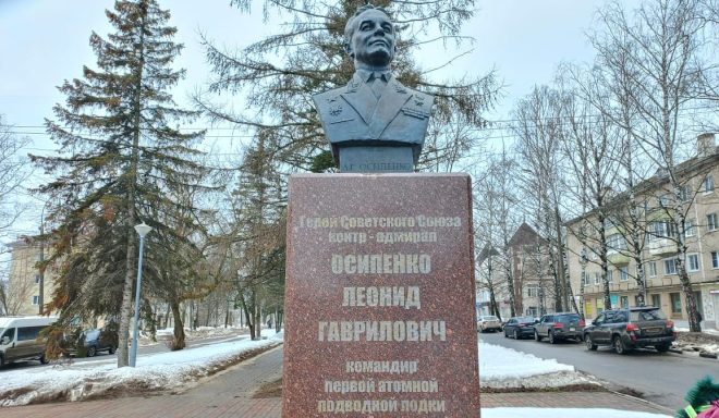 Участники митинга почтили погибших минутой молчания и возложили цветы к мемориалу первопроходцам и памятнику контр-адмиралу Леониду Осипенко – командира первой советской атомной подводной лодки К-3, Героя Советского Союза.