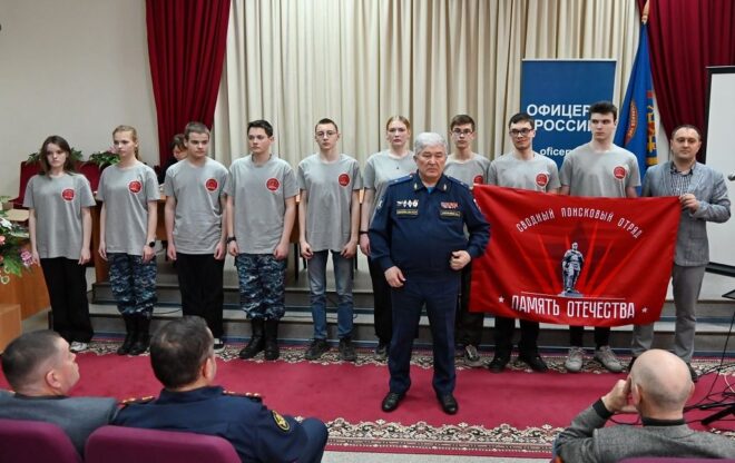 Следующим этапом мероприятия стало вручение именного флага сводному поисковому отряду «Память Отечества». Вновь созданному объединению поисковиков, куда вошли ветераны УИС, пенсионеры военной службы и учащиеся средней школы №67 имени Героя Советского Союза Н.П. Кузнецова, Центра образования №165 имени Героя Советского Союза В.А. Бердышева и лицея №22 «Надежда Сибири», реликвию передал генерал-майор запаса Федор Сокольников. Перед этим ответственным моментом он рассказал о традиции вручения воинским частям боевого знамени, указывающим на ее принадлежность к Вооруженным силам РФ и том, что оно является символом воинской чести, доблести и славы, служит напоминанием каждому военнослужащему о героических традициях и священном долге защиты Отечества.