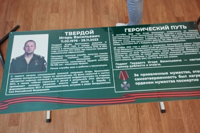 Команда Запорожского регионального отделения «ОФИЦЕРОВ РОССИИ» также приняла участие в открытии «Парты героя» в мелитопольской школе №24. Теперь лучшие ученики будут сидеть за партой с портретом и кратким описанием боевого пути добровольца Игоря Твердого, погибшего под донецкой Клещеевкой.