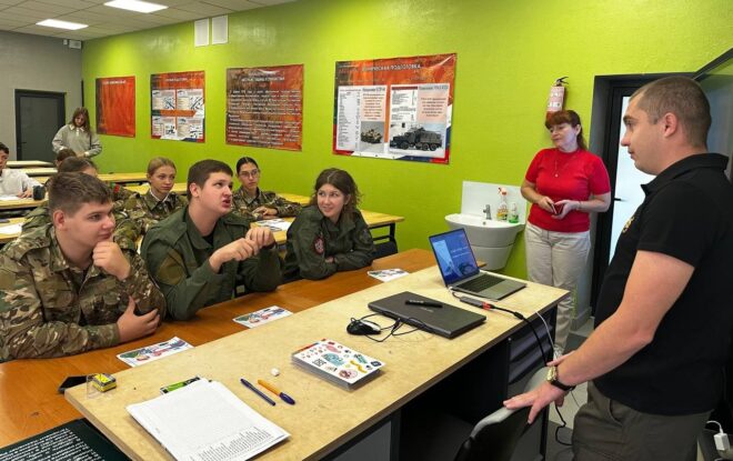 Александр Сергеевич с 2014 года участвовал в обороне Донбасса, в Запорожской области работает с первых дней освобождения региона. Ветеран боевых действий рассказал подросткам о фронтовой дружбе, объяснил причины, по которым пошел воевать, поведал об истоках русского героизма.