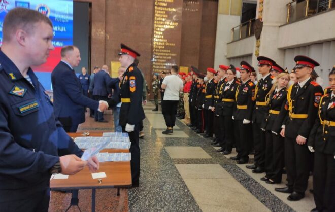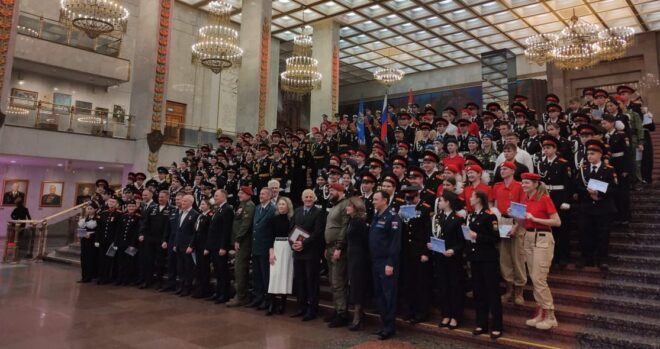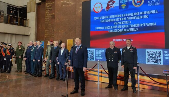 27 января в Музее Победы на Поклонной горе прошла торжественная церемония награждения юнармейцев, прошедших в рамках модульной образовательной программы «Московский юнармеец» обучение по направлению «Парашютист». В зале Полководцев музея собралось более 250 юнармейцев столицы.