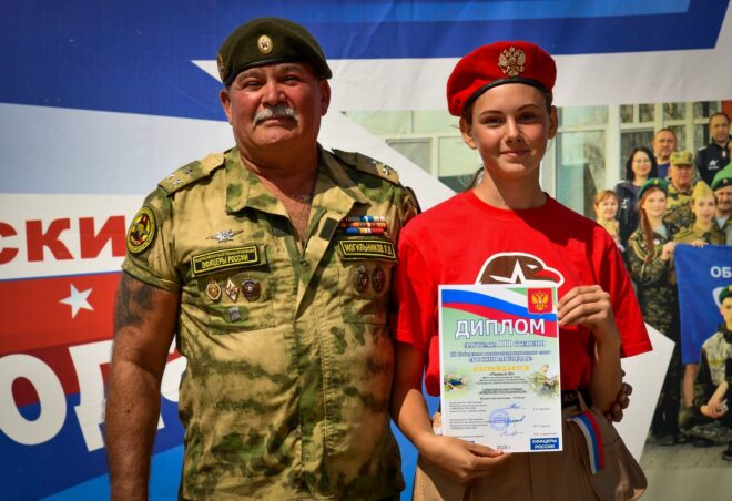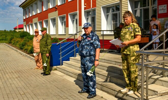 Почетное право поднять государственный флаг РФ под было предоставлено победителю Общероссийского патриотического фестиваля «Никто не забыт, ничто не забыто», командиру ВПК «Факел» Пуштулимскоой школы Елизавете Уколовой.