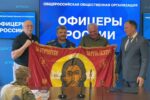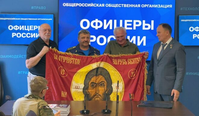 От «ОФИЦЕРОВ РОССИИ» детям подарили книги об участниках СВО «Героями не рождаются. Zа Родину!». Кроме того, отряду было передано знамя с ликом Христа Спасителя. Такие знамена систематически отправляются на фронт.