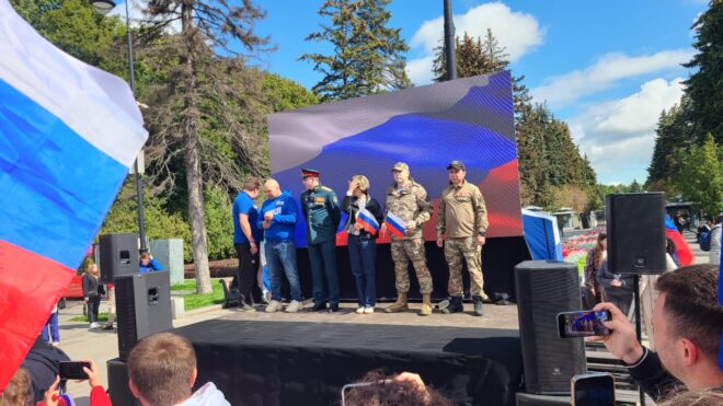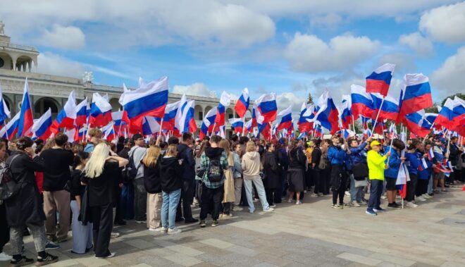 В рамках акции участники прошли по набережной до центральной площади у входа в Речной вокзал. Они выстроились в живую композицию с флагами, создав впечатляющее зрелище единства и патриотизма. На сцене выступили представители общественности, участники СВО, звучали песни о России, наших героях.