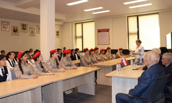 В Российско-таджикской школе в городе Худжанде Согдийской области Республики Таджикистан состоялось значимое событие – встреча поколений защитников Отечества и молодежи. В школьной библиотеке собрались учащиеся, юнармейцы и гости, чтобы прикоснуться к живой истории, услышать слова наставников и почувствовать дух единства и преемственности.