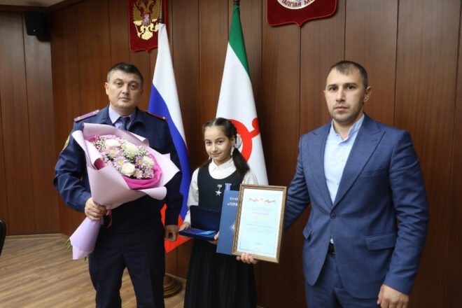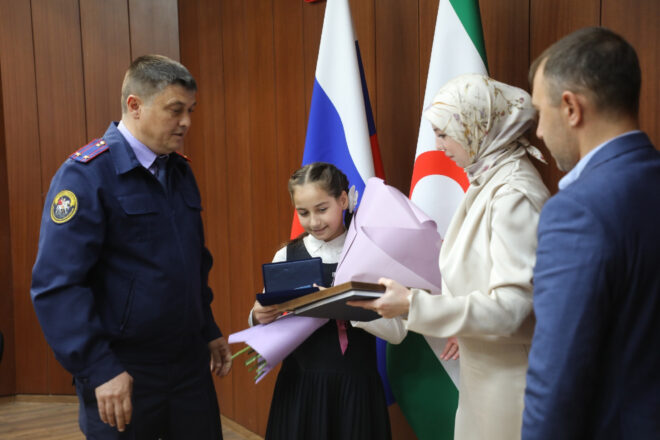В ходе заседания Руслан Галаев и помощник руководителя Следственного управления Следственного комитета России по Республике Ингушетия подполковник юстиции Умар Горчханов вручили награды учащейся гимназии №1 г. Карабулака Хадижи Дзауровой.