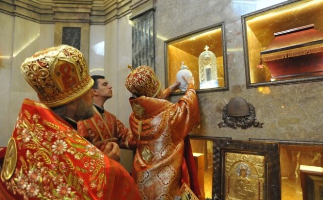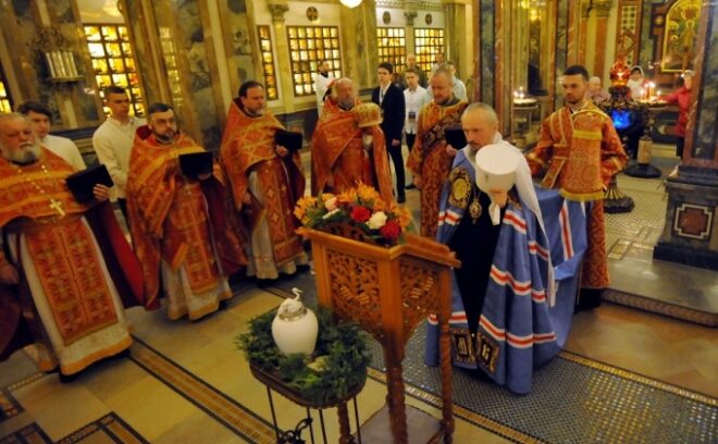 С космодрома Байконура в храм была доставлена капсула с землей с братской могилы, где захоронены десятки человек – военных, ученых, инженеров, в том числе уроженцев Белоруссии.