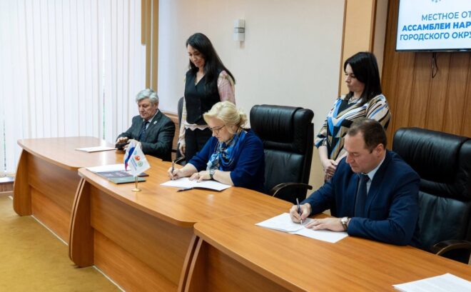 Важной частью мероприятия стало подписание первого в России трехстороннего соглашения о сотрудничестве. Документ объединил подольское отделение Ассамблеи, Общественную палату округа и Совет депутатов.