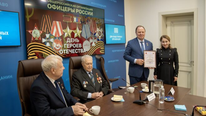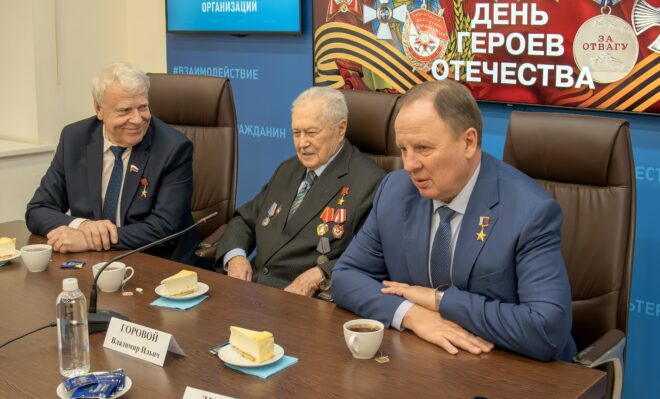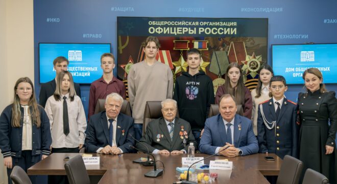 Председатель Президиума «ОФИЦЕРОВ РОССИИ», Герой России генерал-майор Сергей Липовой, председатель Совета мужества и отваги, Герой Советского Союза, ветеран Службы внешней разведки Владимир Горовой и председатель Совета отечественных производителей в сфере обороны и безопасности, Герой Социалистического труда Геннадий Баштанюк провели встречу со школьниками, приуроченную ко Дню Героев Отечества, который в России традиционно отмечается 9 декабря.