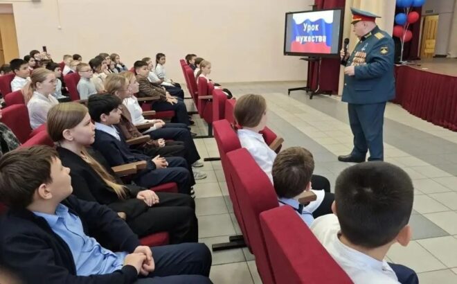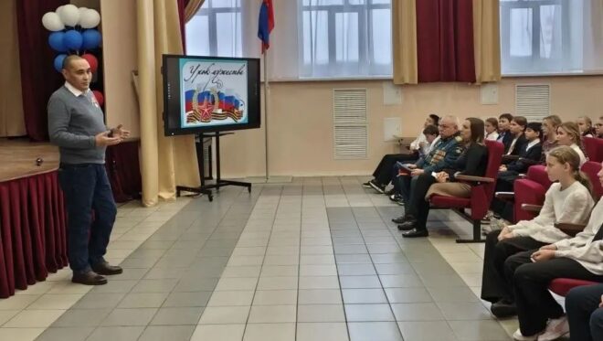 В средней школе №7 г. Сургута прошла встреча с председателем президиума регионального отделения «ОФИЦЕРОВ РОССИИ» в ХМАО – Югре подполковником в отставке Александром Сусидко и участником СВО Булатом Байтургановым.