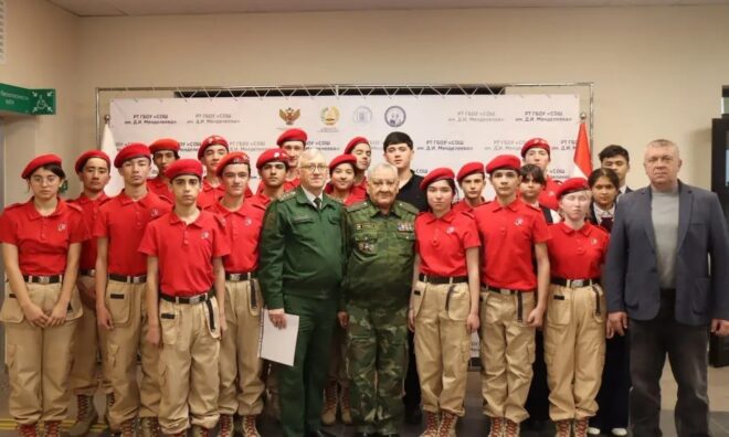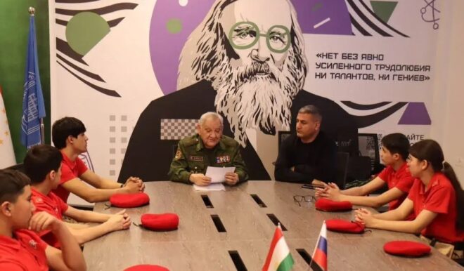 В Российско-таджикской школе им. Д.И. Менделеева в г. Турсун-Заде в рамках военно-патриотического месячника прошла встреча юнармейцев с членом организации «ОФИЦЕРЫ РОССИИ» генерал-майором Уктамом Тошматовым.