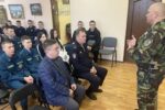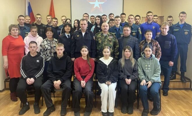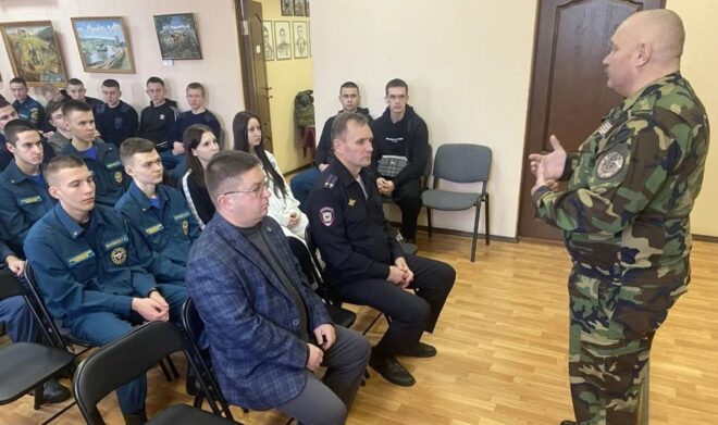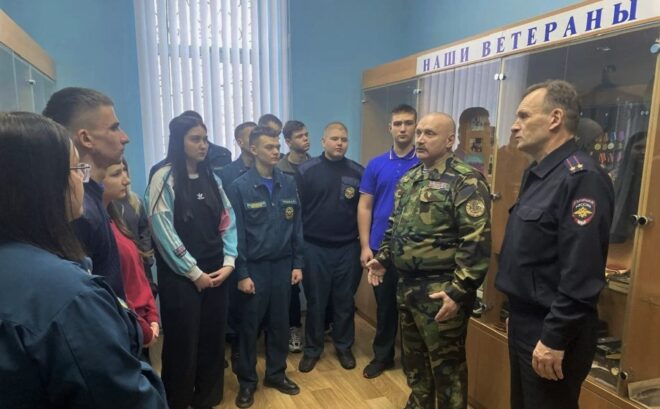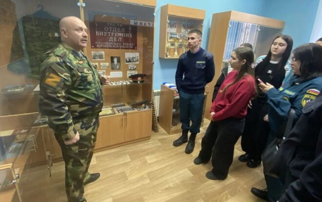 Сергей Викторович рассказал учащимся профессионального лицея №55 г. Россоши о своей службе, о деятельности ветеранов, гуманитарных миссиях в зону СВО, а потом провел экскурсию по музею.