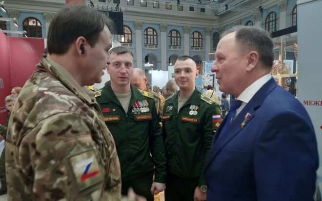 После открытия выставки в амфитеатре Гостиного двора Сергей Липовой выступил на встрече ветеранов Вооруженных сил, ветеранов боевых действий и участников специальной военной операции с курсантами, кадетами и школьниками из Москвы и Твери.