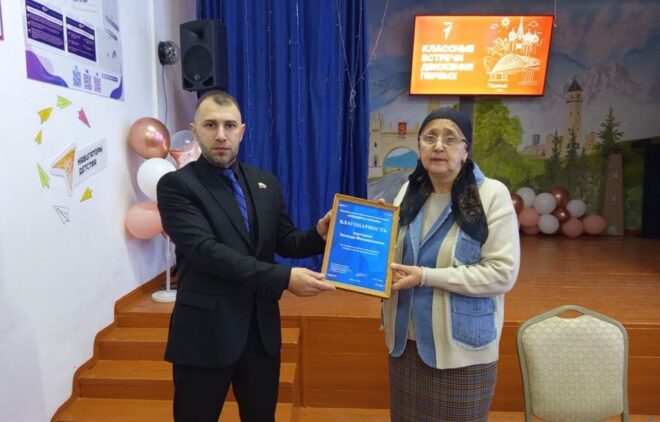 В ходе визита Руслан Галаев вручил директору школы Зинаиде Хаутиевой и коллективу благодарности за активное участие в совместных мероприятиях патриотической направленности.
