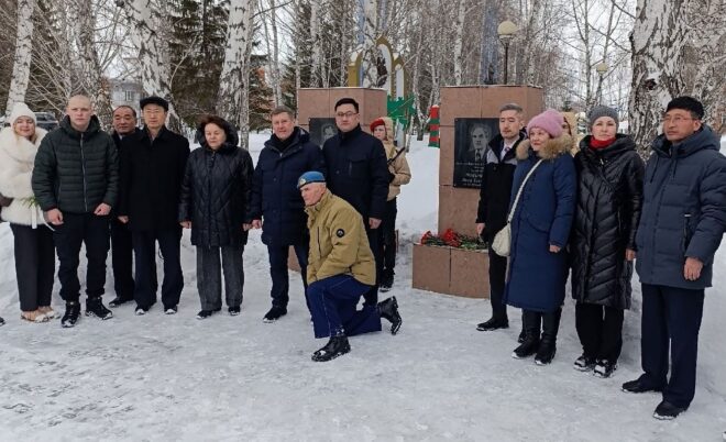 Первым пунктом насыщенной программы стало посещение Доволенского района – малой родины героя. В районном центре делегация возложила цветы к стеле, установленной в честь героя, а затем поехали в Травное. Чувствовалось, что жители хранят память о знаменитом земляке – местная школа названа его именем. Учащиеся показали гостям школьный музей, увековечивающий память выдающихся земляков, выступили с творческим номерами. Затем в актовом зале школы прошел урок мужества.
