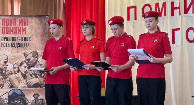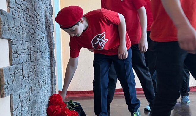 В зале школы собрались родные, одноклассники и друзья Родионова, а также семья Ильи Кужлева, погибшего в 2005-м. Гости читали стихи о Родине и защитниках Отечества.